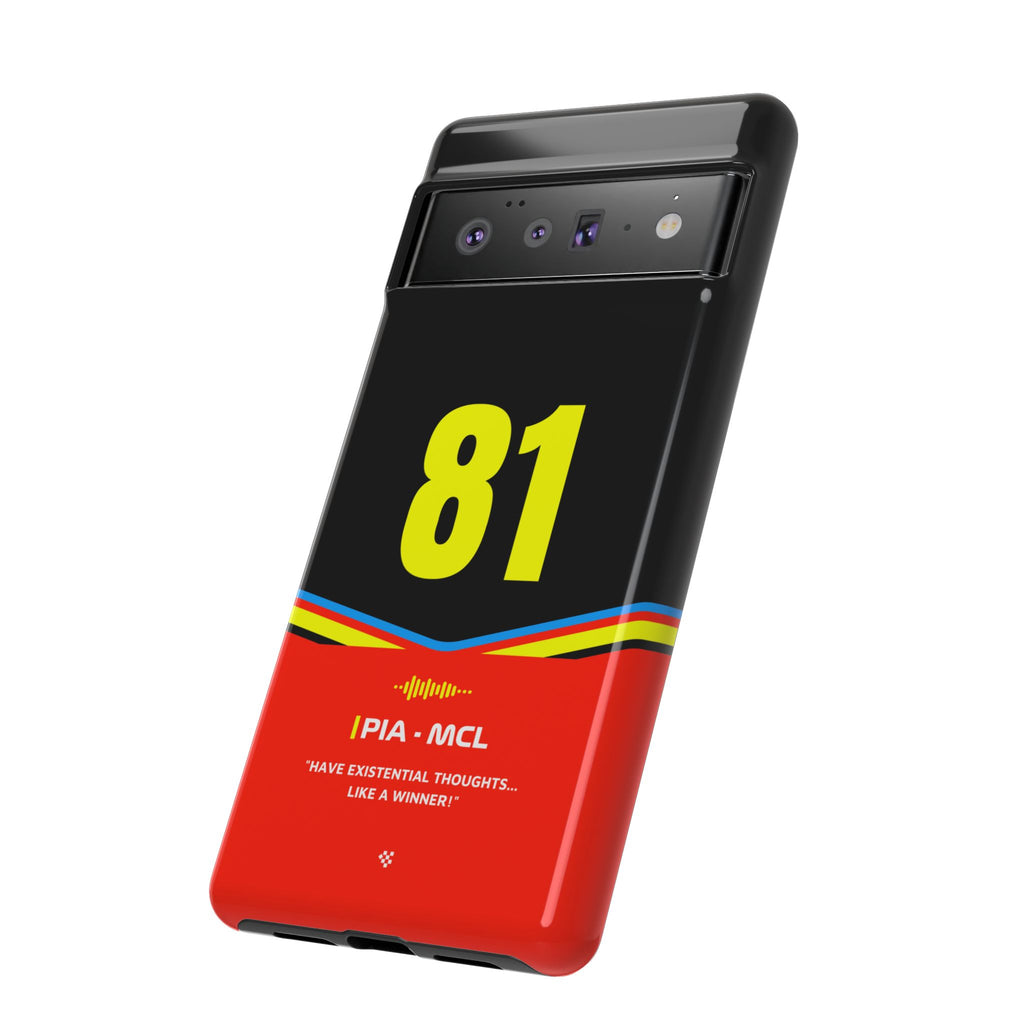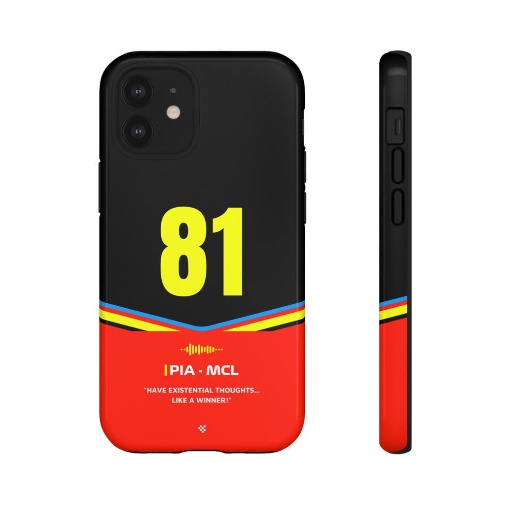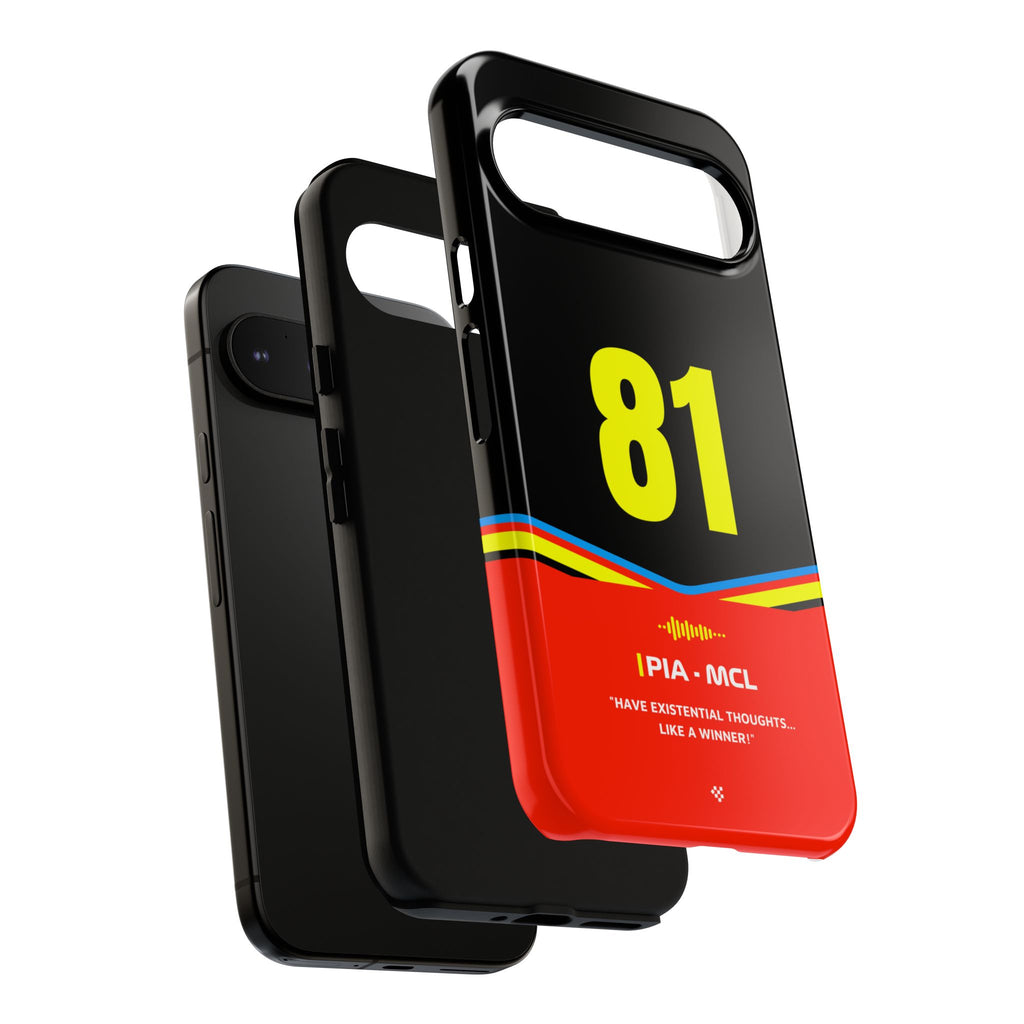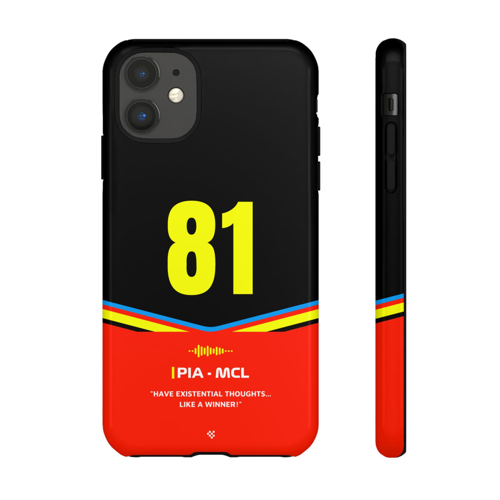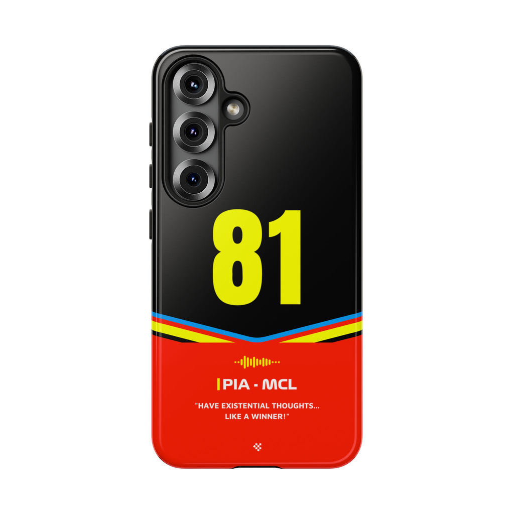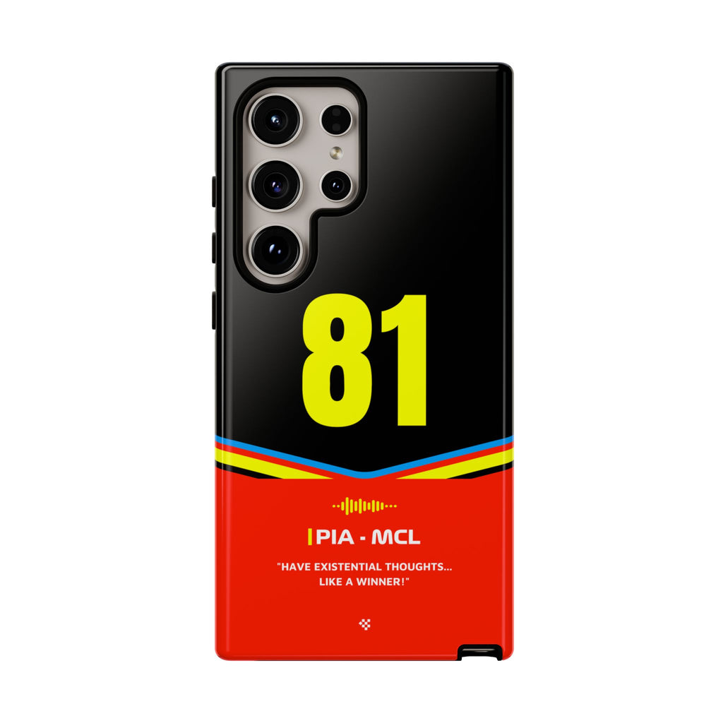 Support your favorite F1 driver with the exclusive Oscar Piastri F1 2025 Helmet Phone Case. It's the perfect accessory for every passionate Formula 1 and Piastri fan. Featuring Oscar's iconic #81 race number and his bold 2025 helmet colors, this black phone case brings racing energy straight to your hand.