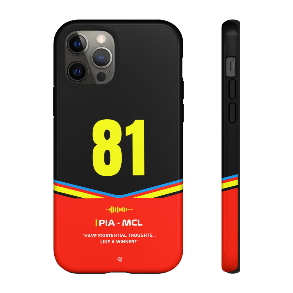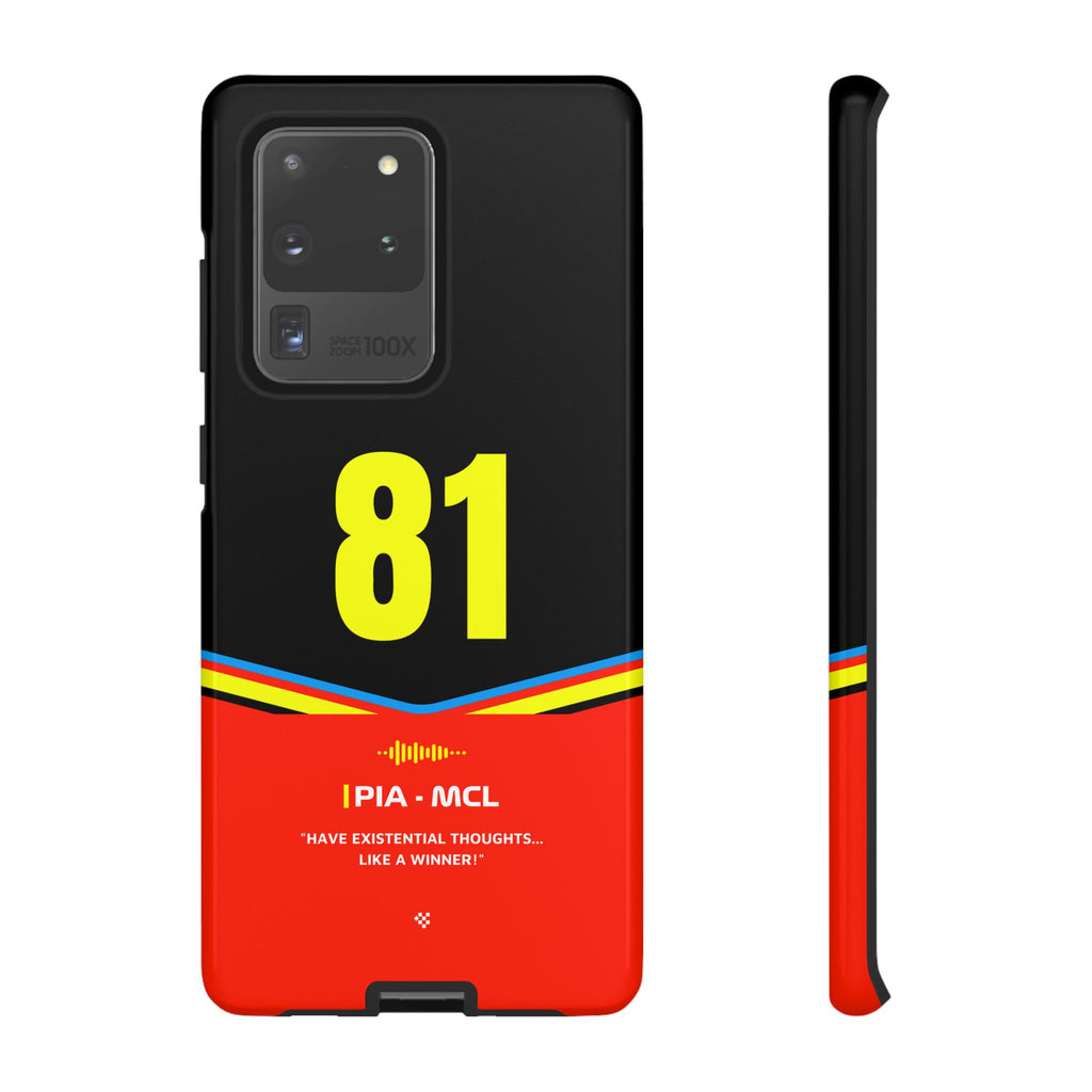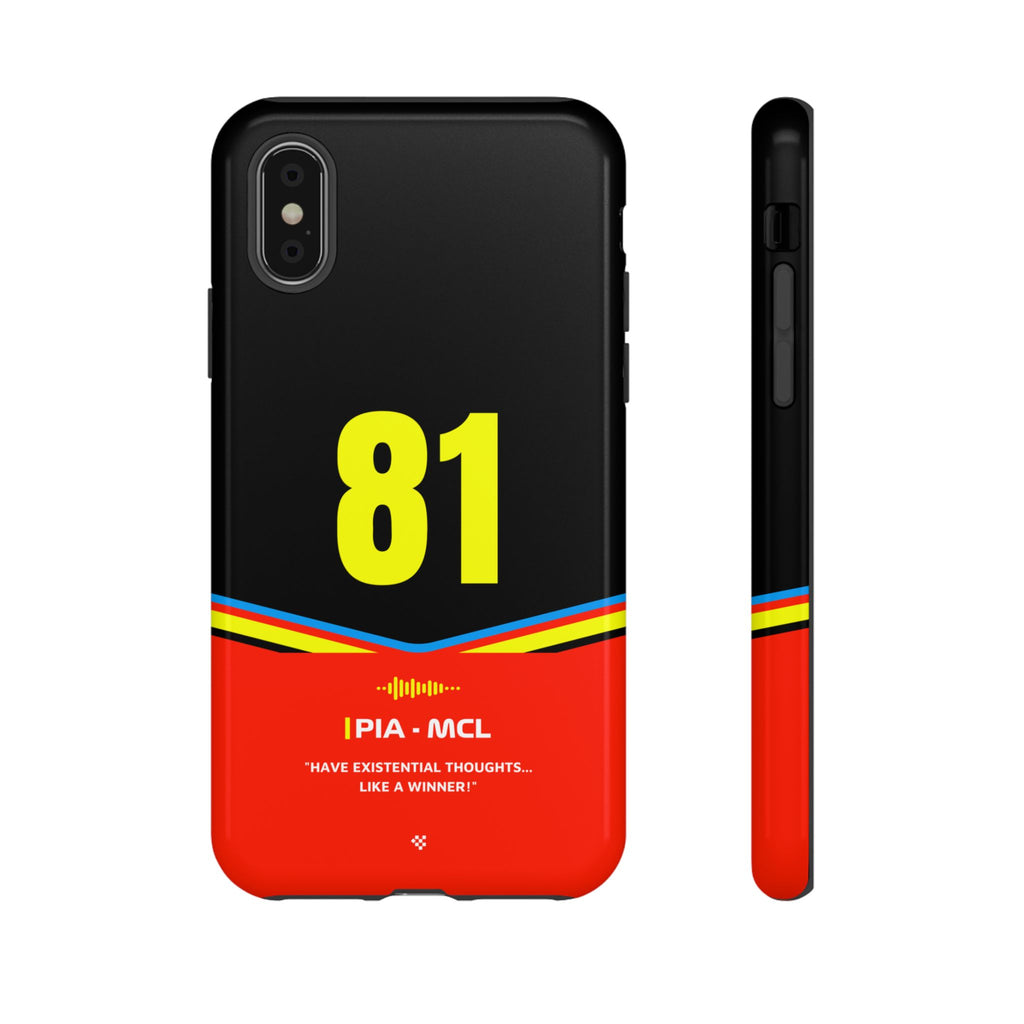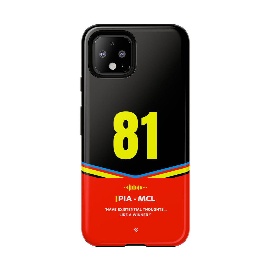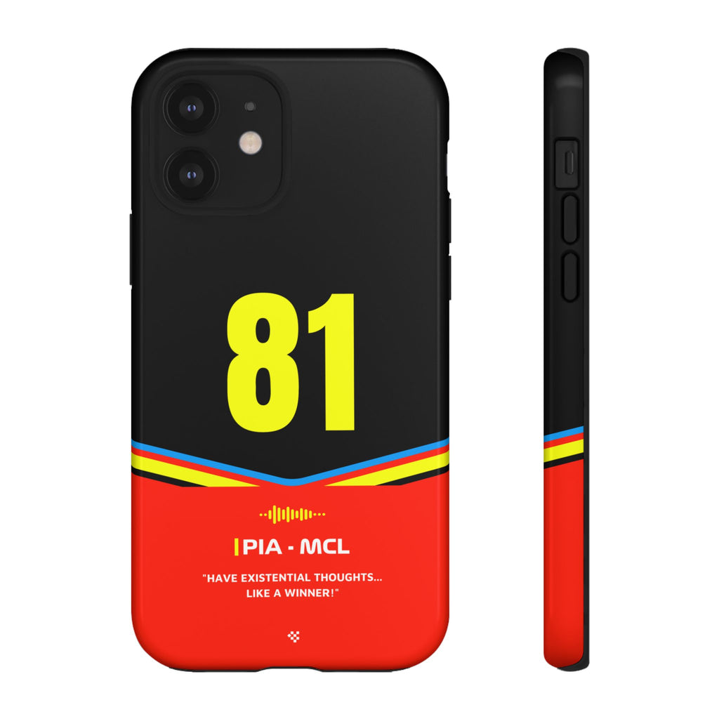 Support your favorite F1 driver with the exclusive Oscar Piastri F1 2025 Helmet Phone Case. It's the perfect accessory for every passionate Formula 1 and Piastri fan. Featuring Oscar's iconic #81 race number and his bold 2025 helmet colors, this black phone case brings racing energy straight to your hand.
