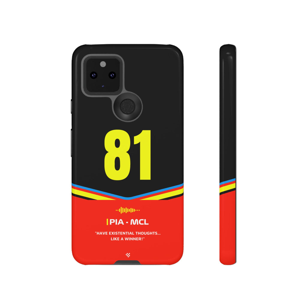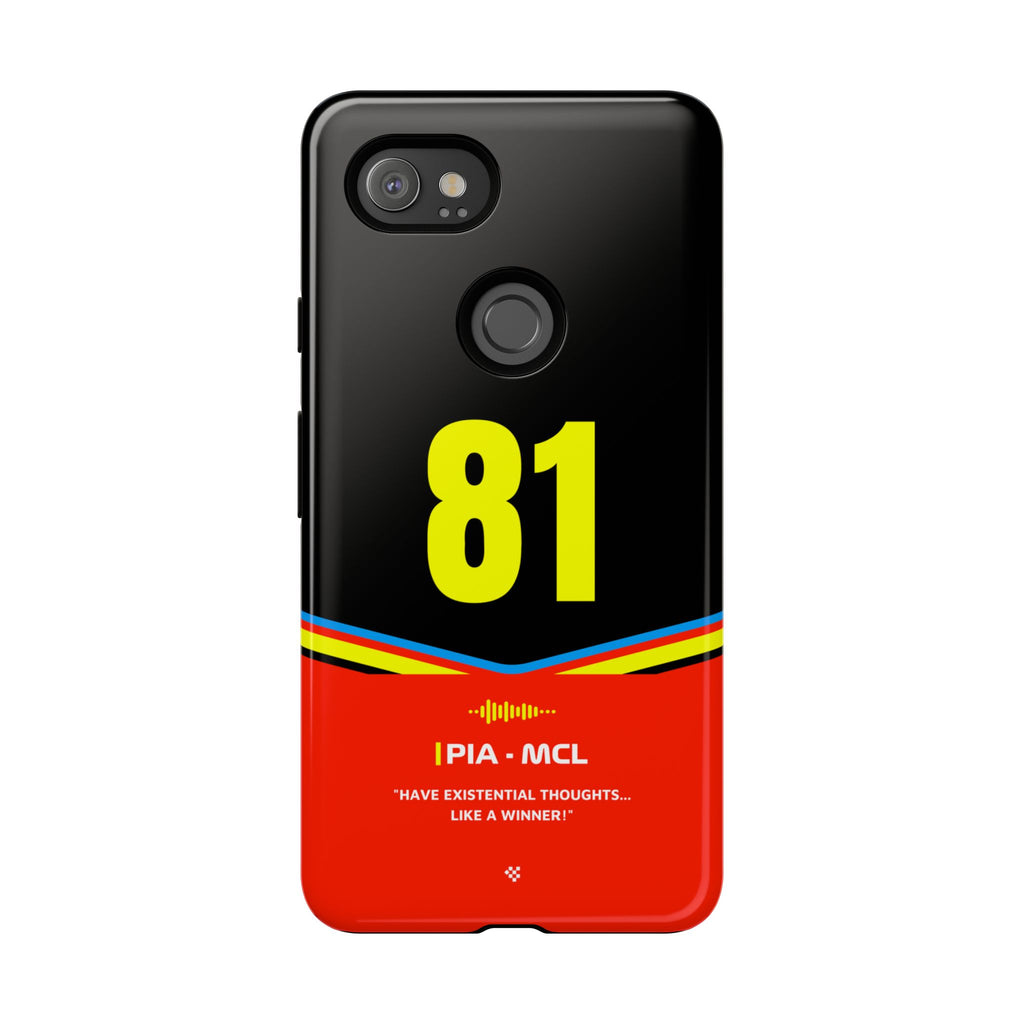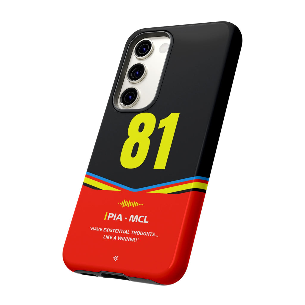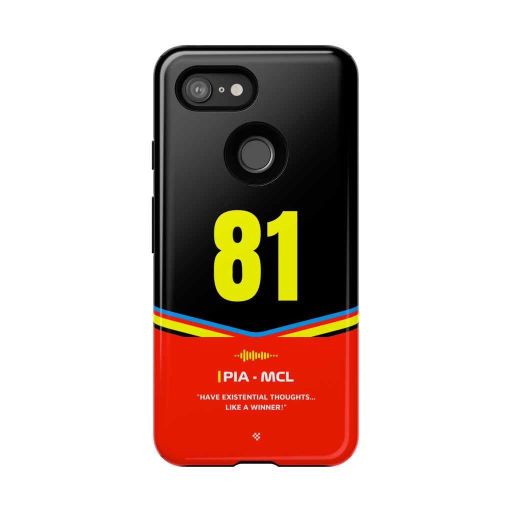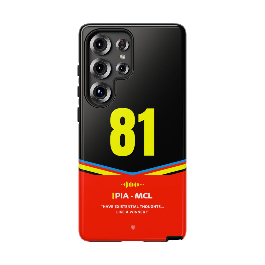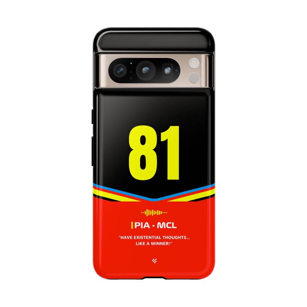 Support your favorite F1 driver with the exclusive Oscar Piastri F1 2025 Helmet Phone Case. It's the perfect accessory for every passionate Formula 1 and Piastri fan. Featuring Oscar's iconic #81 race number and his bold 2025 helmet colors, this black phone case brings racing energy straight to your hand.