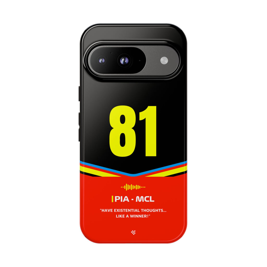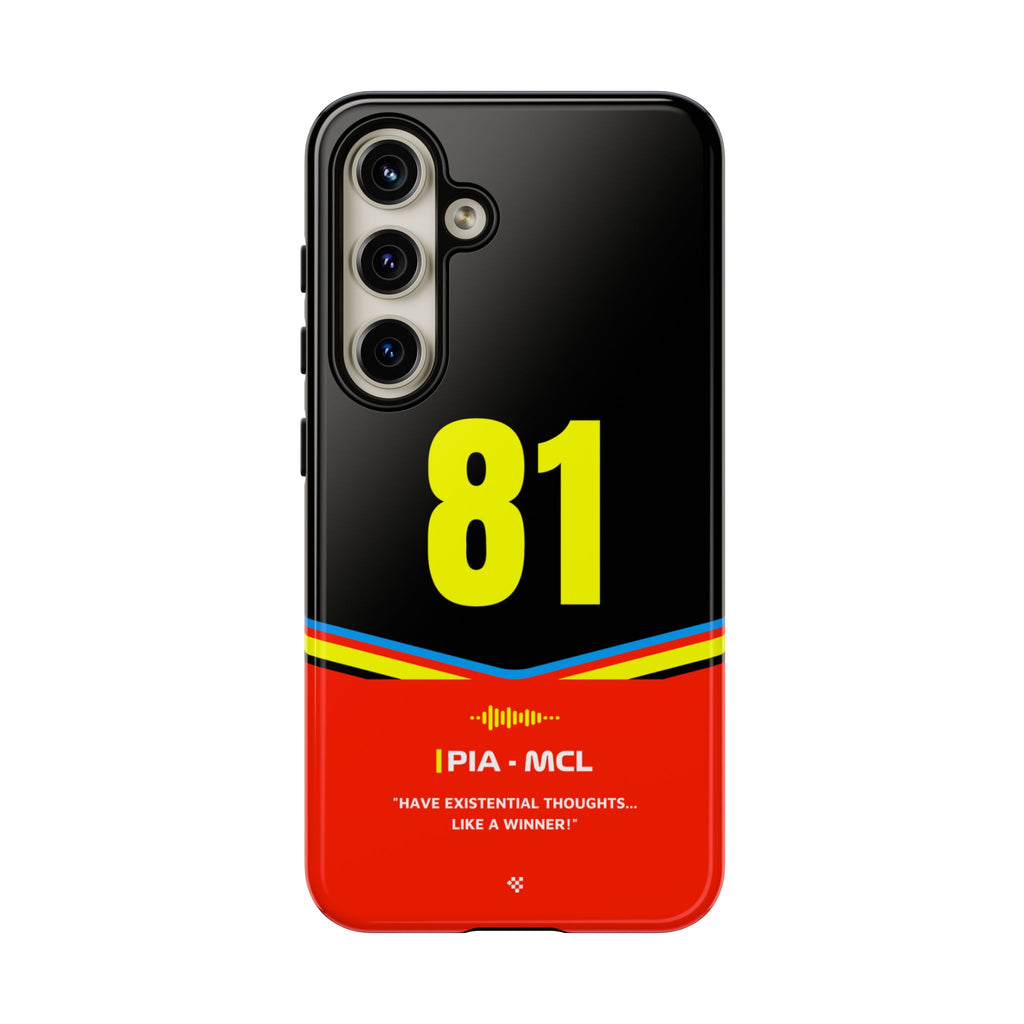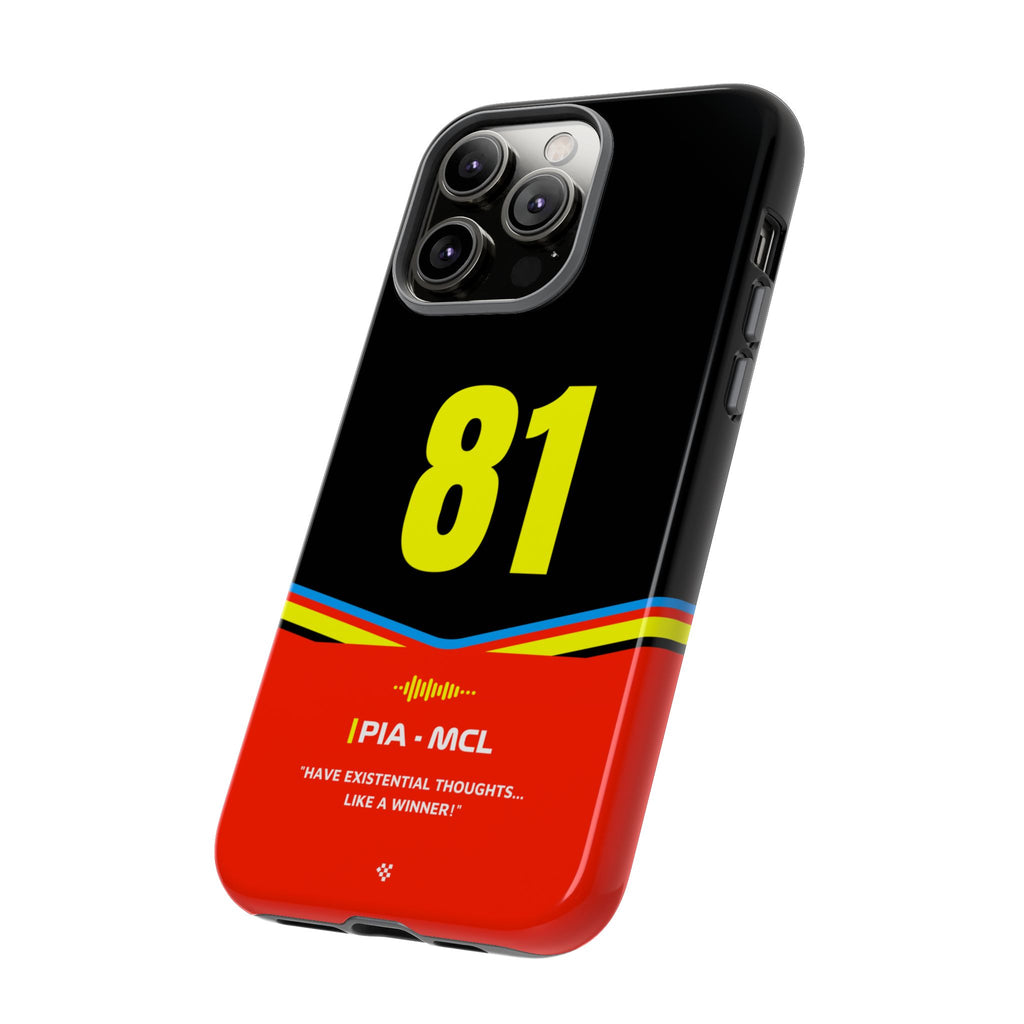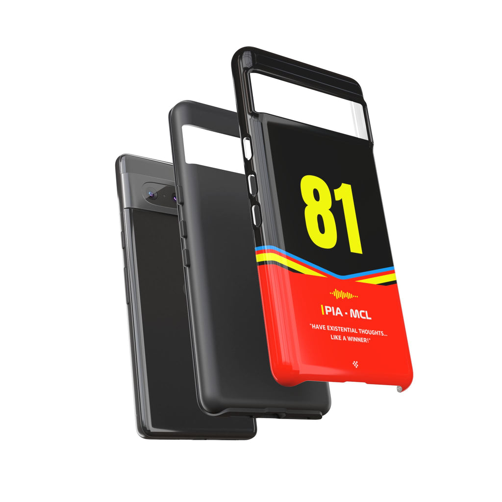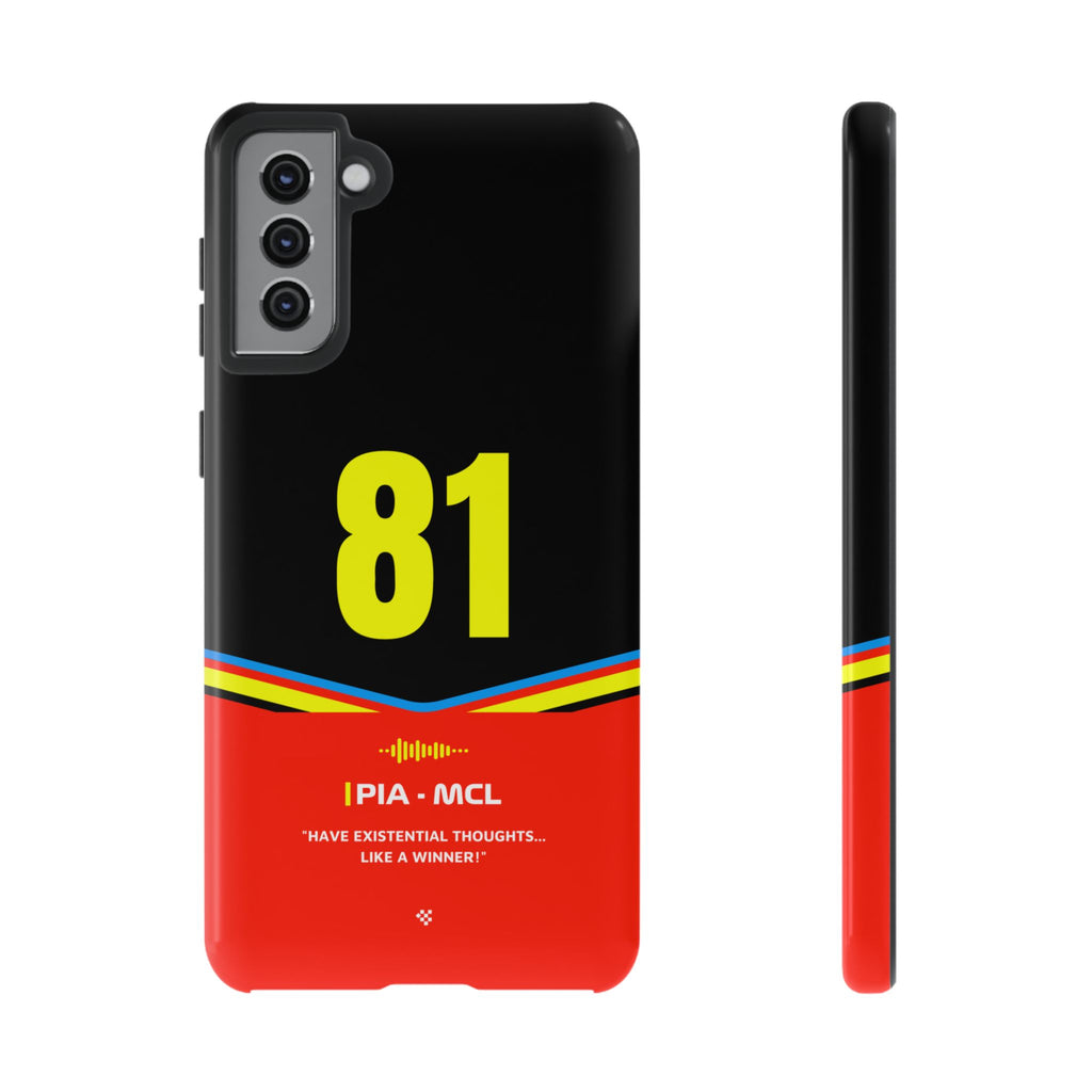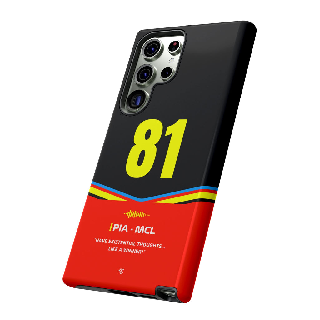 Support your favorite F1 driver with the exclusive Oscar Piastri F1 2025 Helmet Phone Case. It's the perfect accessory for every passionate Formula 1 and Piastri fan. Featuring Oscar's iconic #81 race number and his bold 2025 helmet colors, this black phone case brings racing energy straight to your hand.