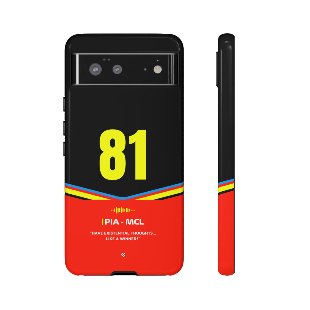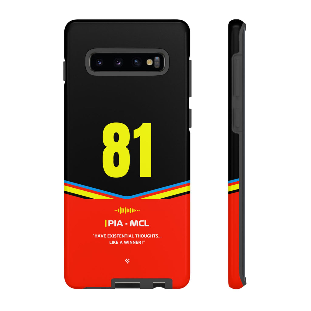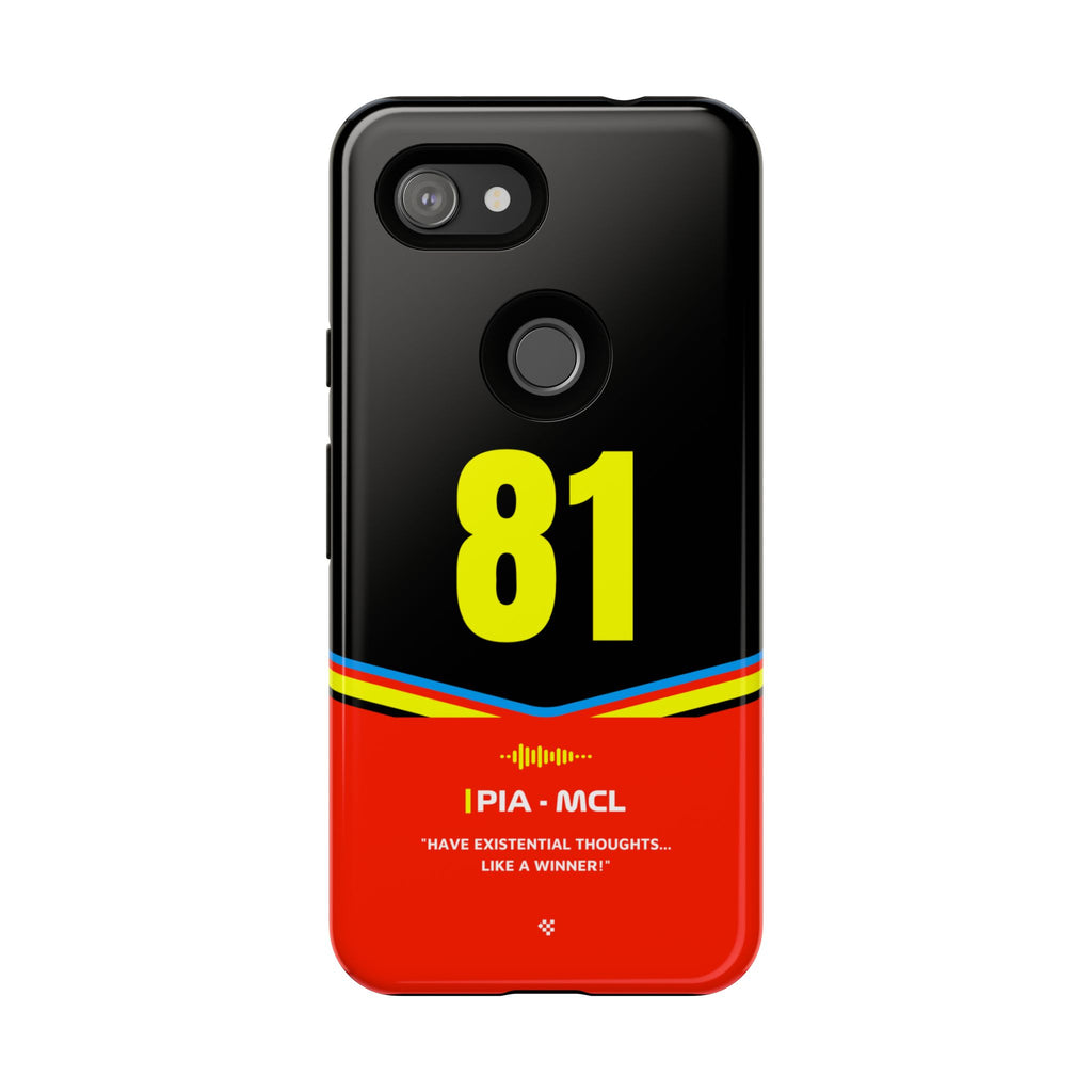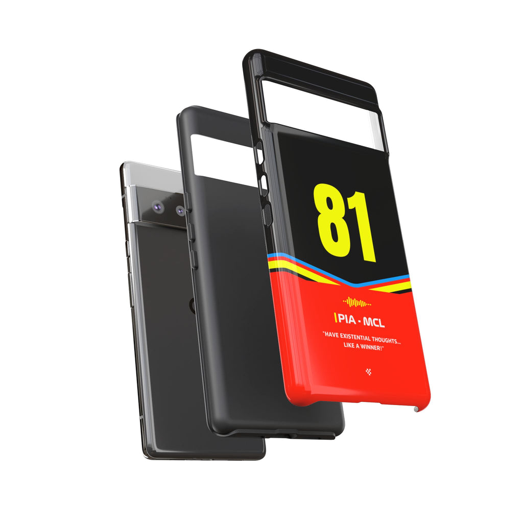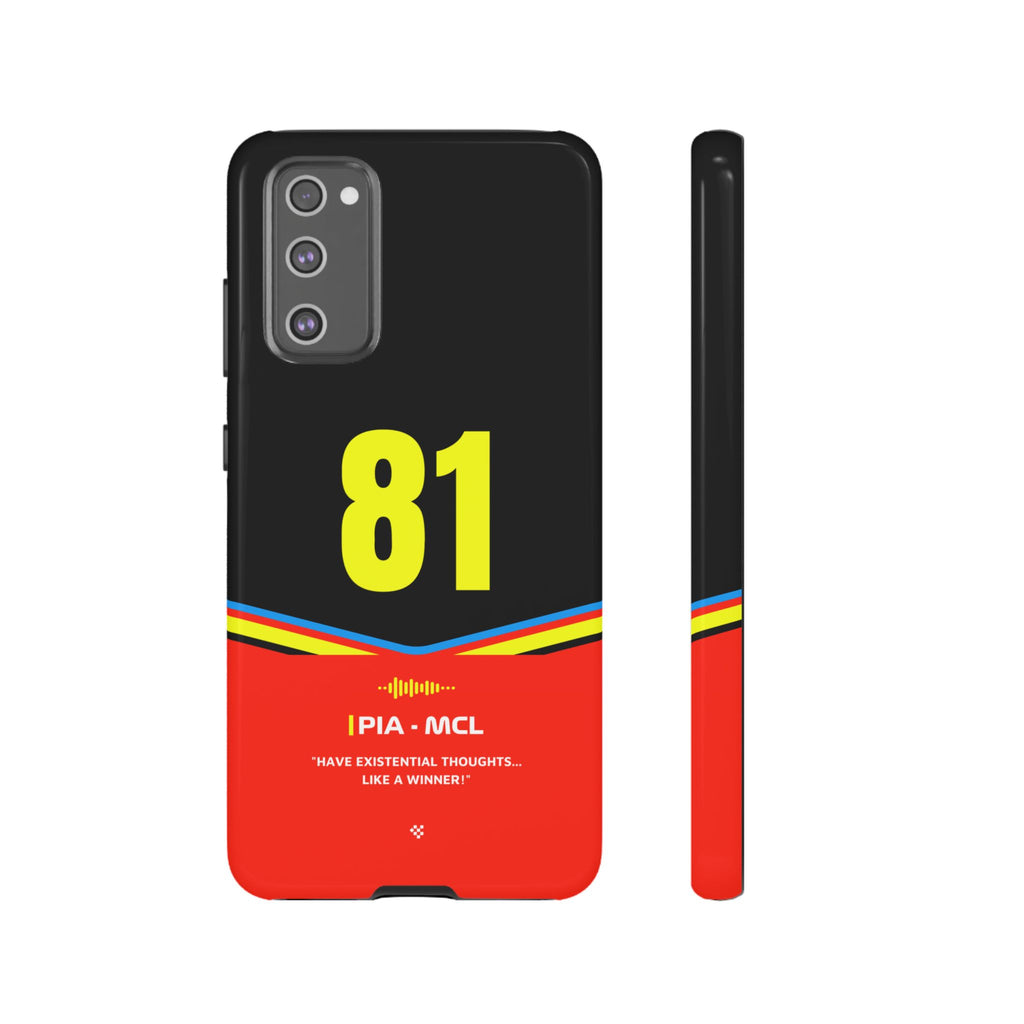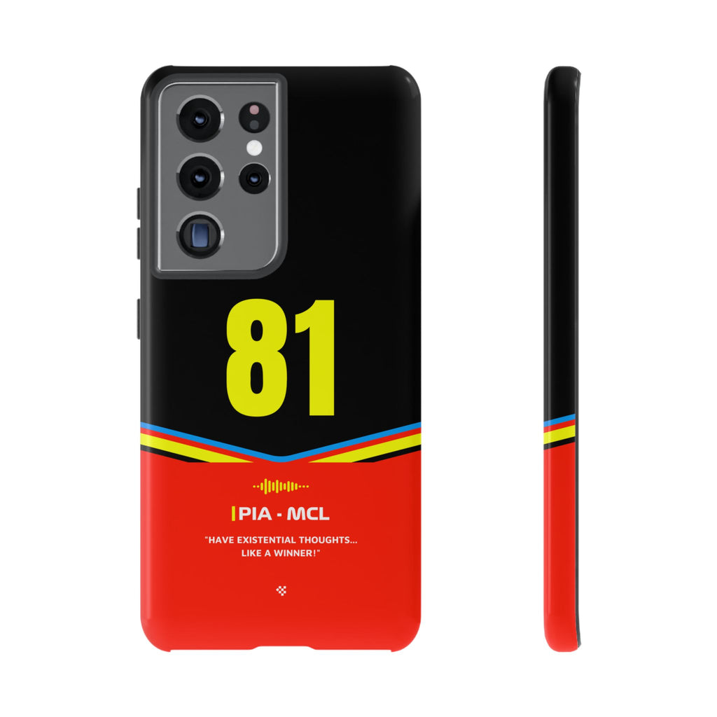 Support your favorite F1 driver with the exclusive Oscar Piastri F1 2025 Helmet Phone Case. It's the perfect accessory for every passionate Formula 1 and Piastri fan. Featuring Oscar's iconic #81 race number and his bold 2025 helmet colors, this black phone case brings racing energy straight to your hand.