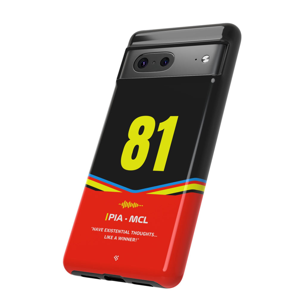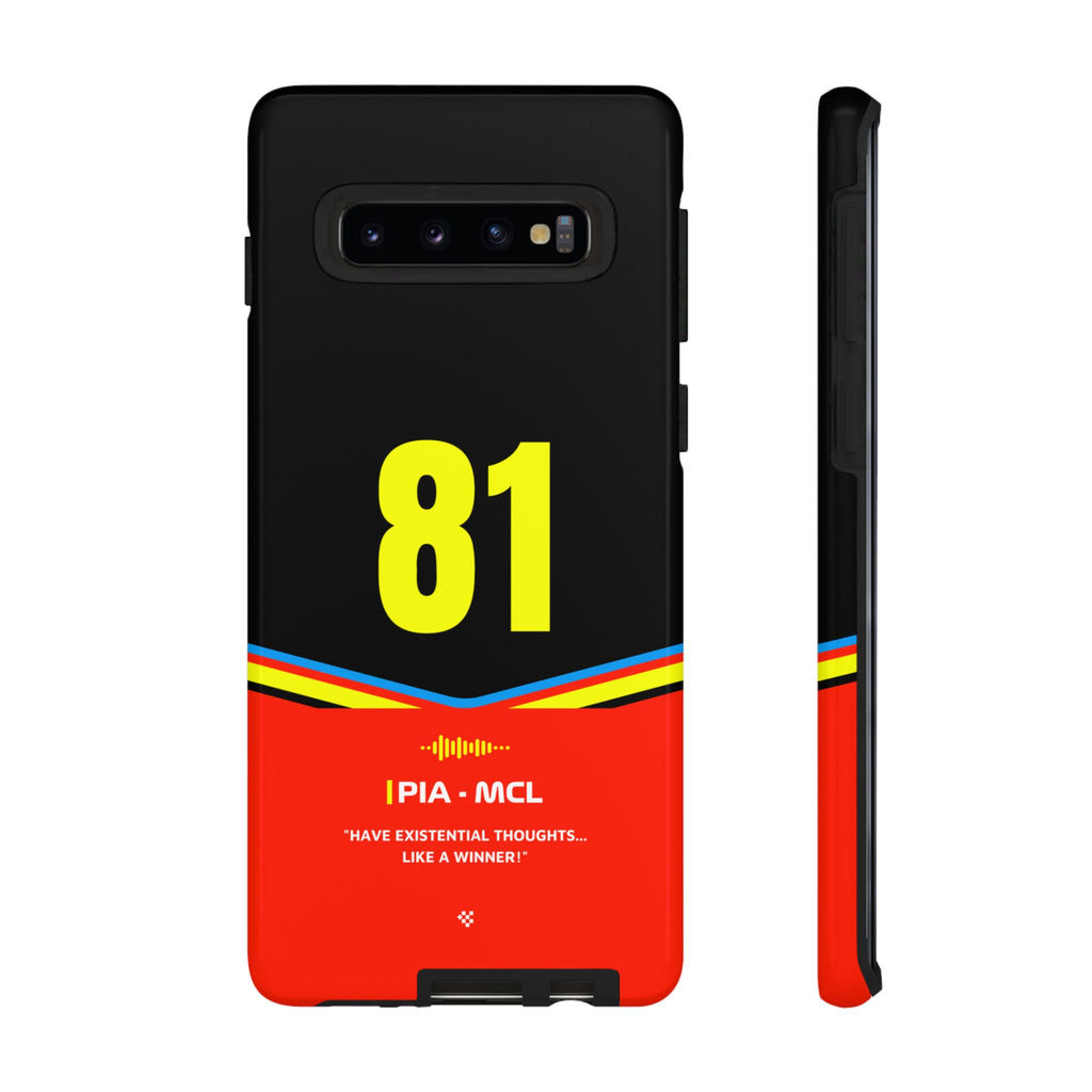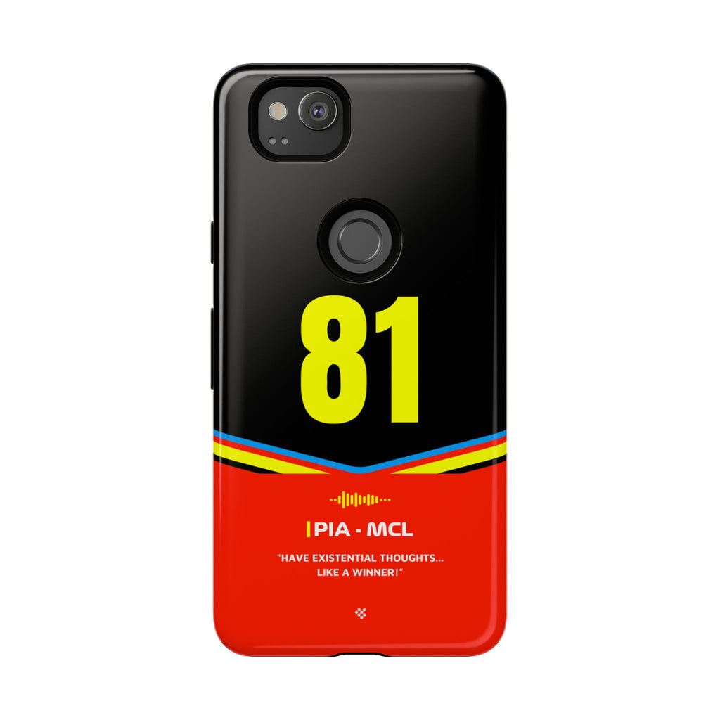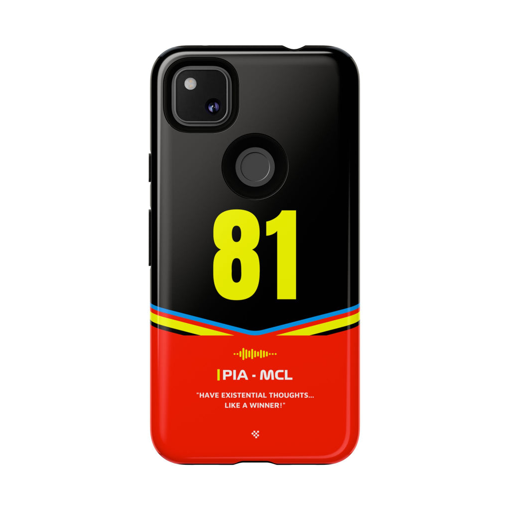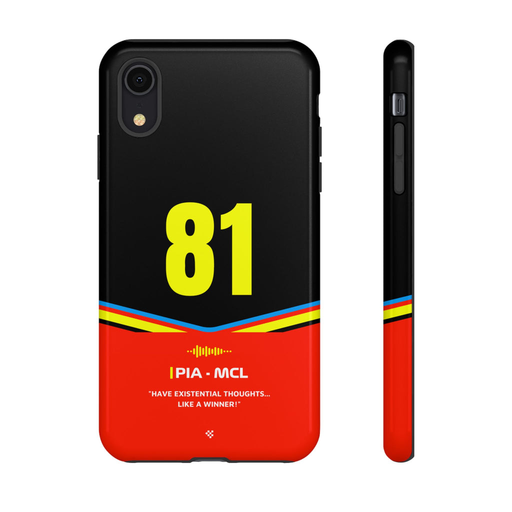 Support your favorite F1 driver with the exclusive Oscar Piastri F1 2025 Helmet Phone Case. It's the perfect accessory for every passionate Formula 1 and Piastri fan. Featuring Oscar's iconic #81 race number and his bold 2025 helmet colors, this black phone case brings racing energy straight to your hand.
