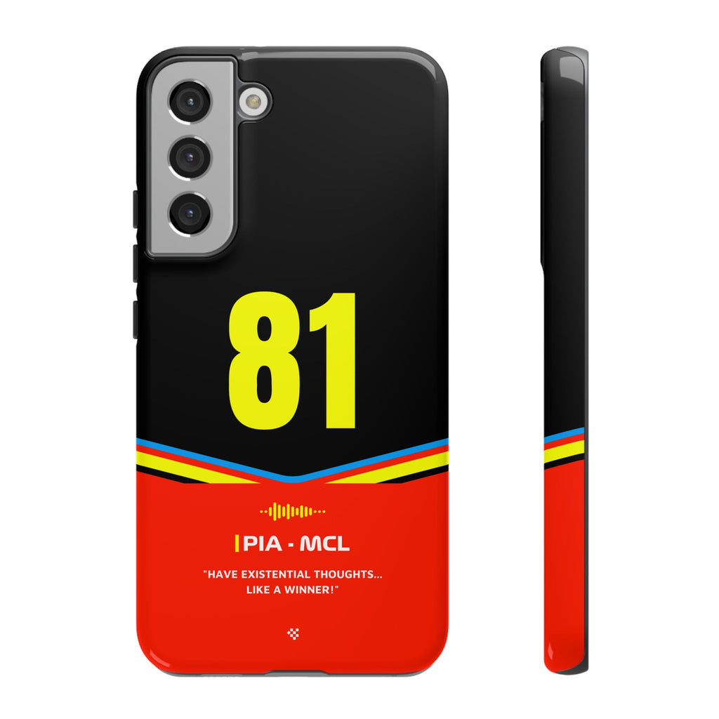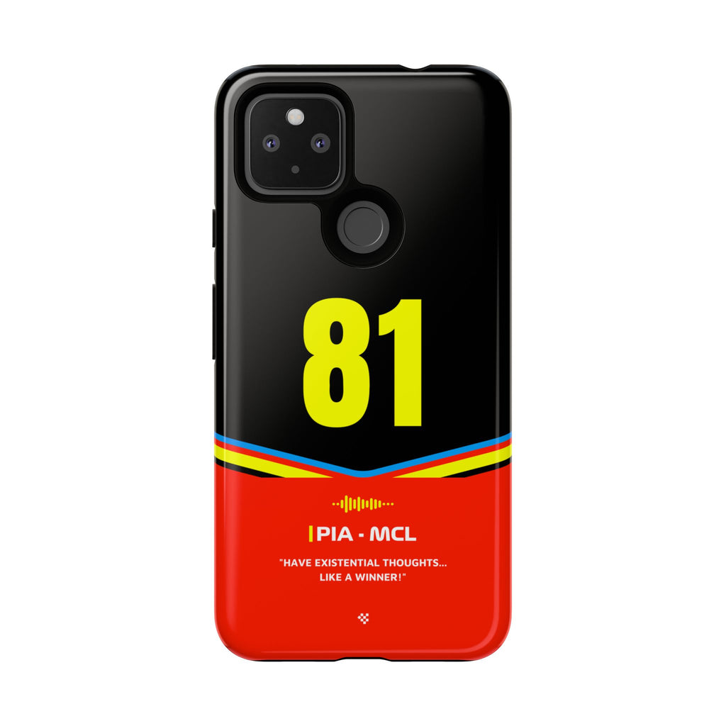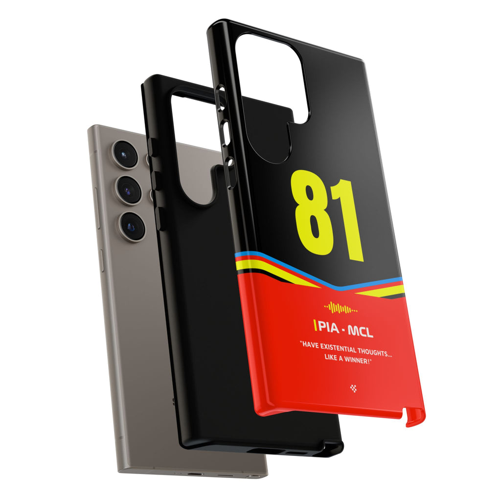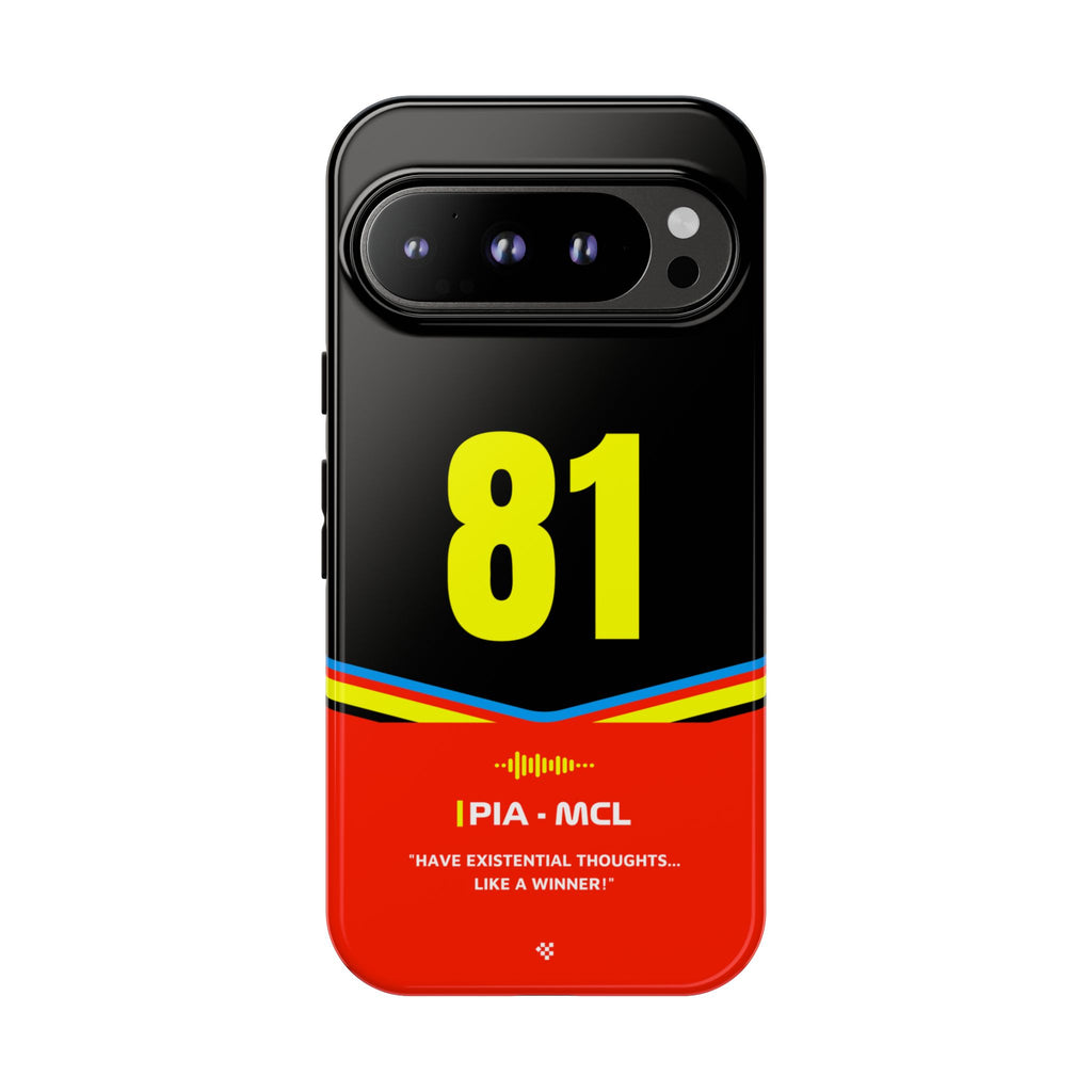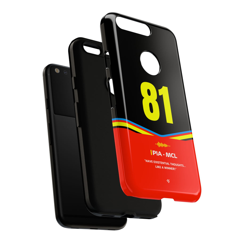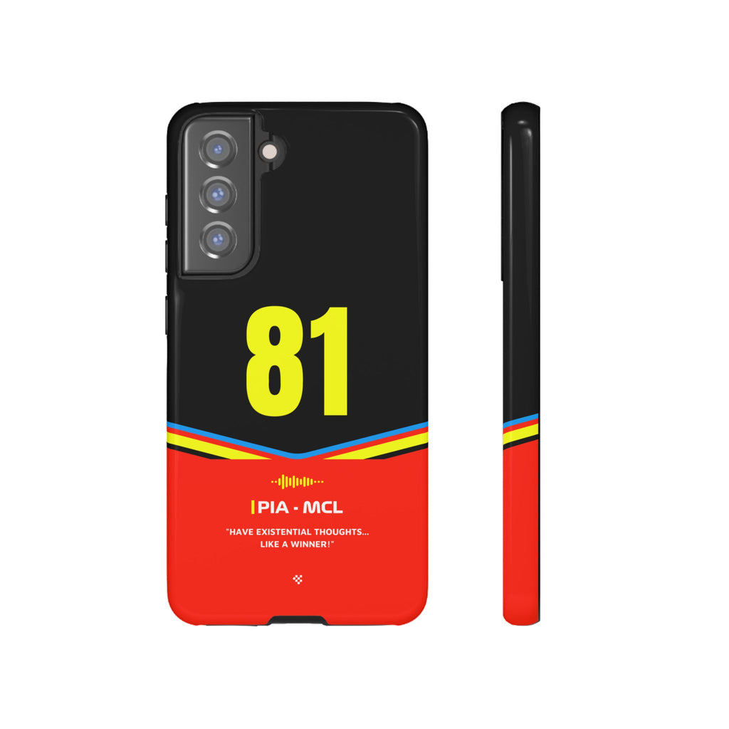 Support your favorite F1 driver with the exclusive Oscar Piastri F1 2025 Helmet Phone Case. It's the perfect accessory for every passionate Formula 1 and Piastri fan. Featuring Oscar's iconic #81 race number and his bold 2025 helmet colors, this black phone case brings racing energy straight to your hand.