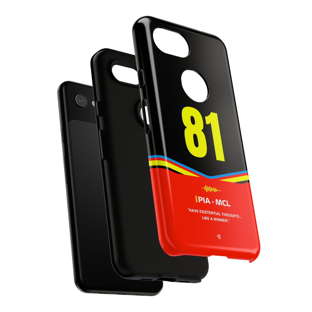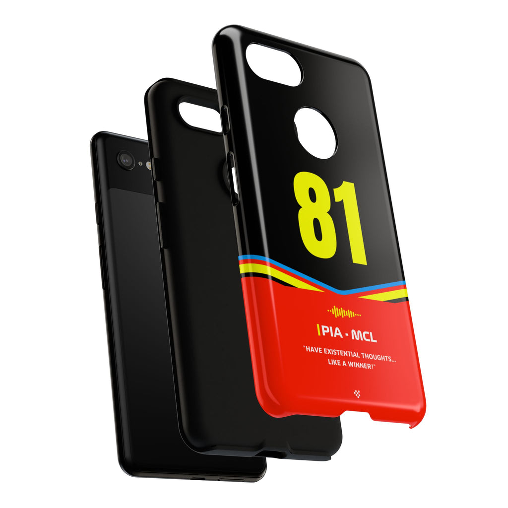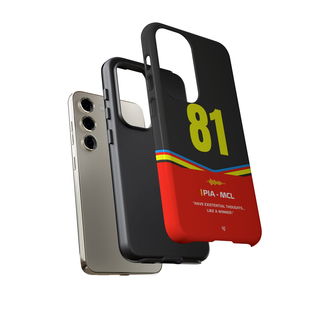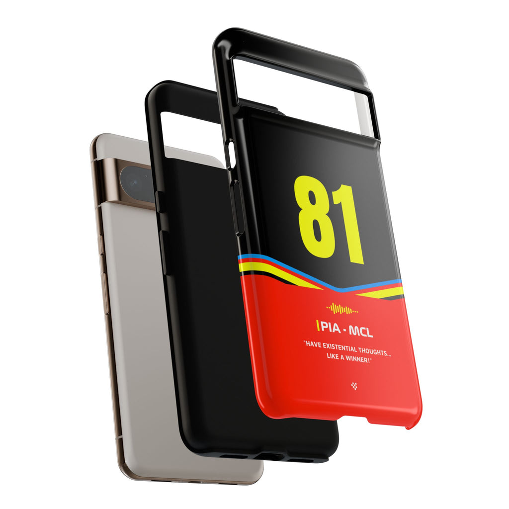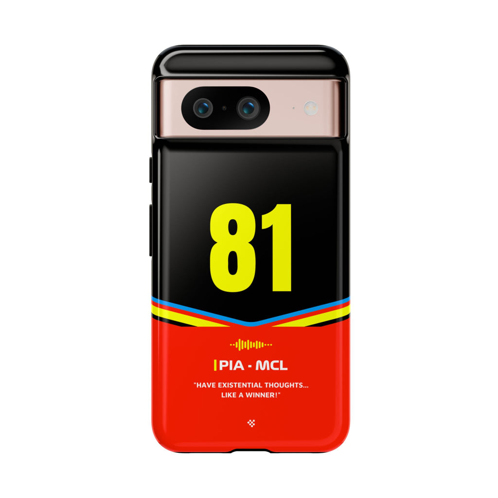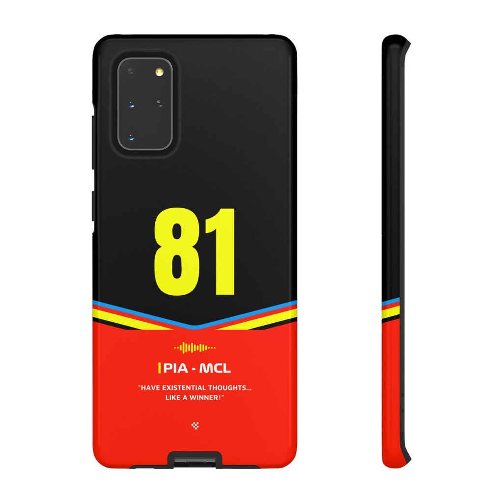 Support your favorite F1 driver with the exclusive Oscar Piastri F1 2025 Helmet Phone Case. It's the perfect accessory for every passionate Formula 1 and Piastri fan. Featuring Oscar's iconic #81 race number and his bold 2025 helmet colors, this black phone case brings racing energy straight to your hand.