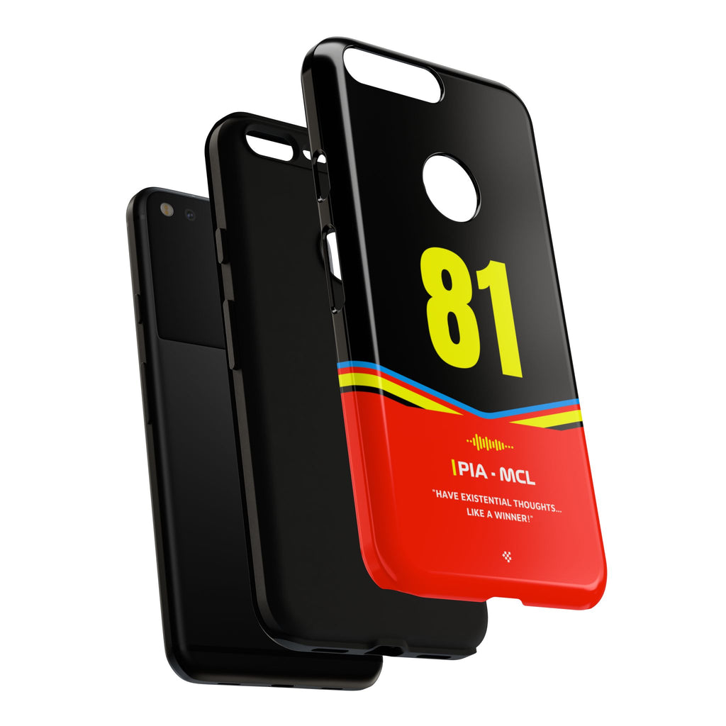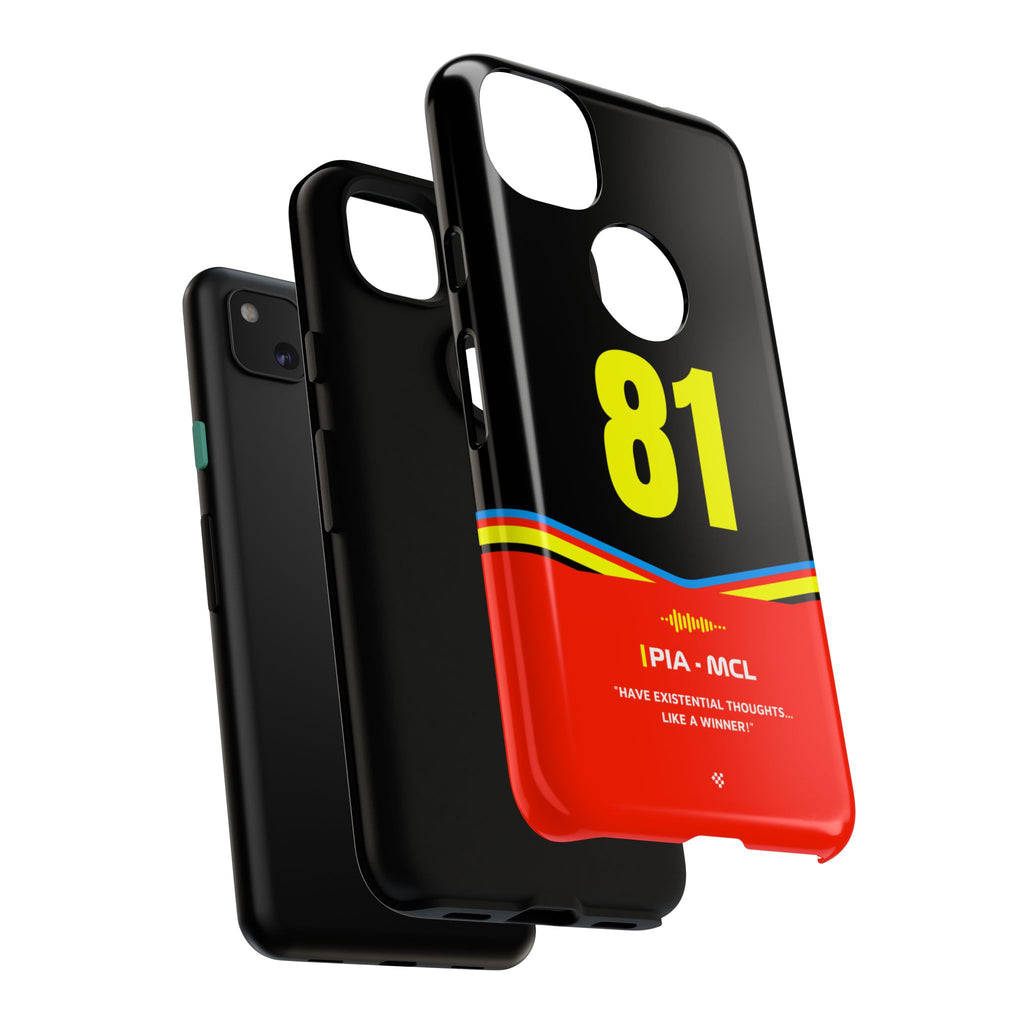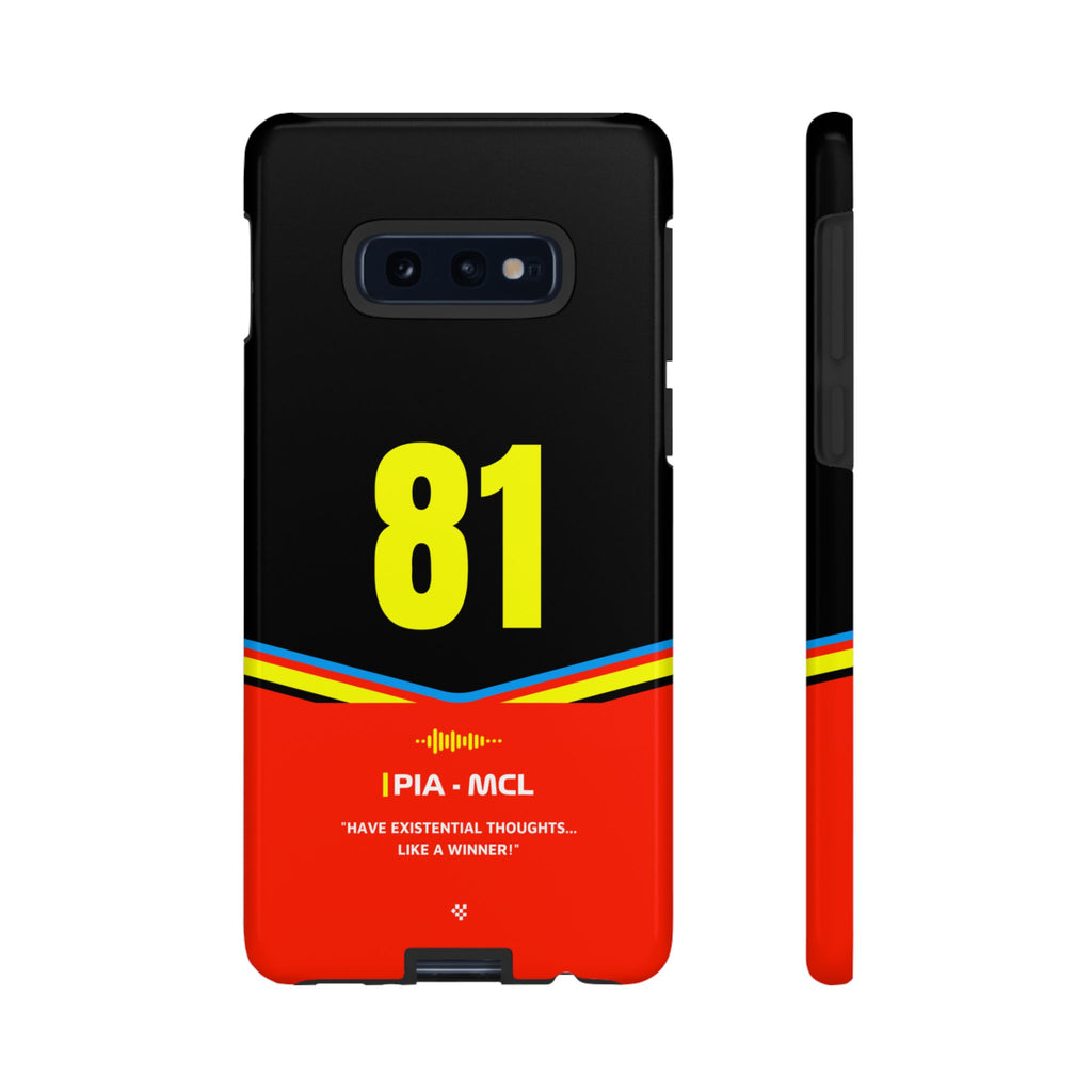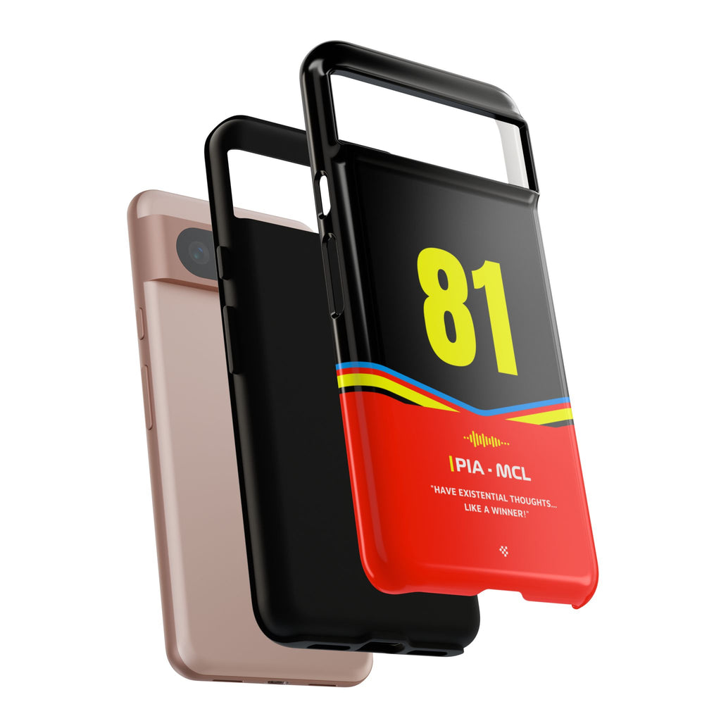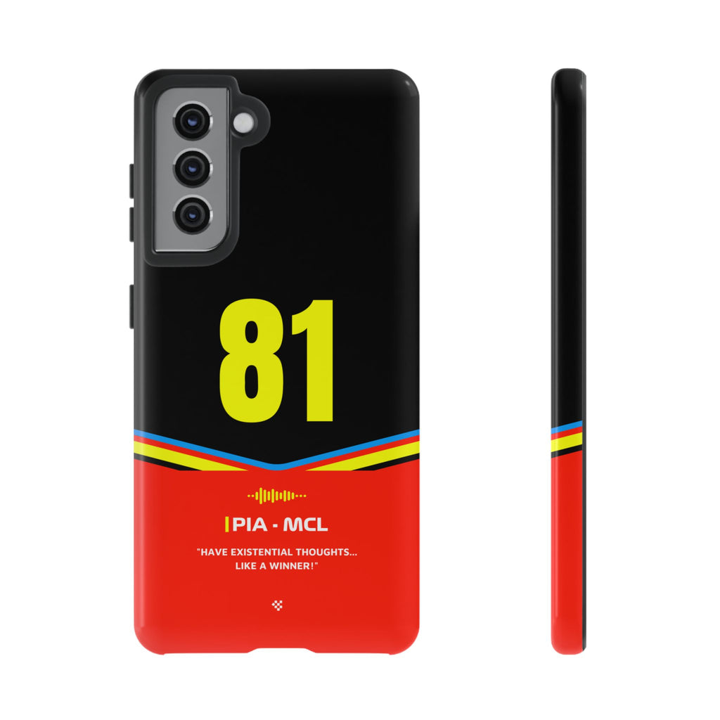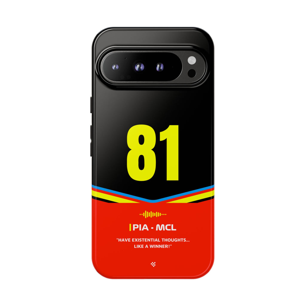 Support your favorite F1 driver with the exclusive Oscar Piastri F1 2025 Helmet Phone Case. It's the perfect accessory for every passionate Formula 1 and Piastri fan. Featuring Oscar's iconic #81 race number and his bold 2025 helmet colors, this black phone case brings racing energy straight to your hand.